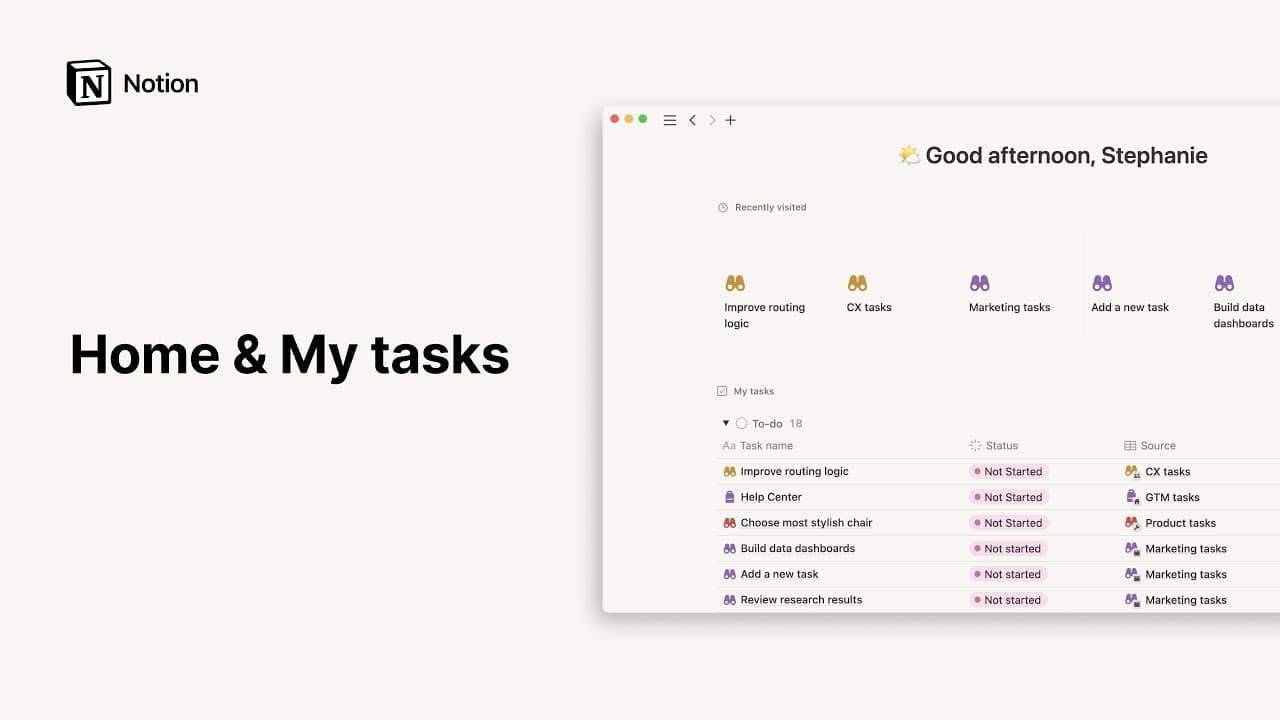 En Notion, todo sucede en un espacio de trabajo. Es tu hogar virtual donde puedes organizar la información y crear contenido a tu manera, de forma individual, junto con un equipo o con toda la empresa. Amplíalo, edítalo y adáptalo a tus necesidades 🏠